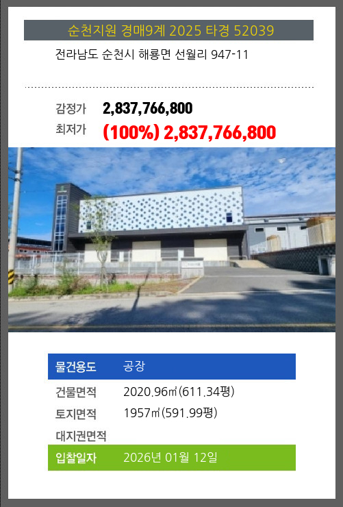 사건번호 2025 타경 52039 본건은 전라남도 순천시 해룡면 선월리 947-11소재하는 공장경매 물건의 포스팅입니다. 건물면적 [ 2020.96㎡ (611.34평) ]토지면적 [ 1957㎡ (591.99평) ] 시세를 반영한 감정가