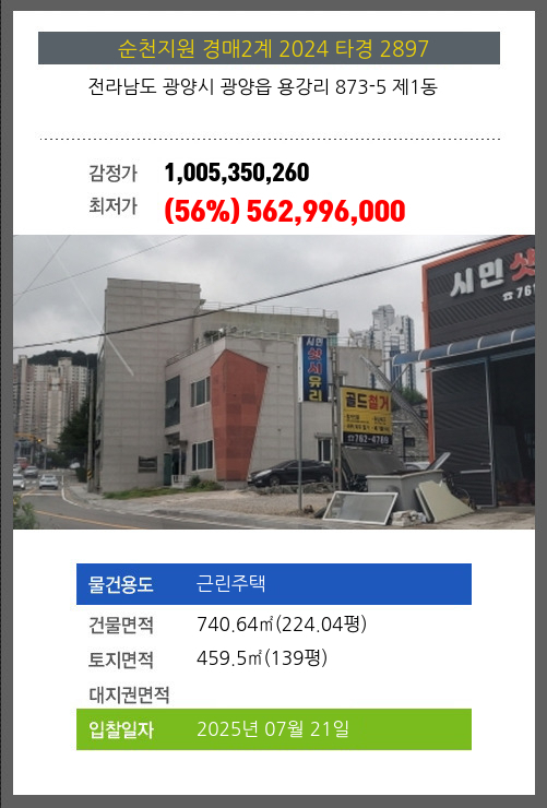 사건번호 2024 타경 2897 본건은 전라남도 광양시 광양읍 용강리 873-5 제1동소재하는 근린주택경매 물건의 포스팅입니다. 건물면적 [ 740.64㎡ (224.04평) ]토지면적 [ 459.5㎡ (139평) ] 시세를 반영한