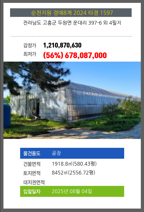 사건번호 2024 타경 1597 본건은 전라남도 고흥군 두원면 운대리 397-6 외 4필지소재하는 공장경매 물건의 포스팅입니다. 건물면적 [ 1918.8㎡ (580.43평) ]토지면적 [ 8452㎡ (2556.72평) ] 시세를