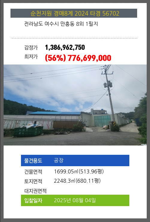사건번호 2024 타경 56702 본건은 전라남도 여수시 만흥동 8외 1필지소재하는 공장경매 물건의 포스팅입니다. 건물면적 [ 1699.05㎡ (513.96평) ]토지면적 [ 2248.3㎡ (680.11평) ] 시세를 반영한 감정가