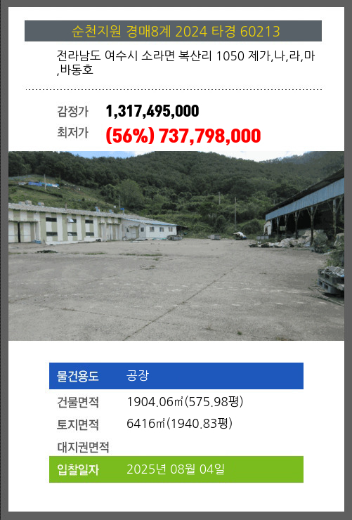 사건번호 2024 타경 60213 본건은 전라남도 여수시 소라면 복산리 1050 제가,나,라,마,바동호소재하는 공장경매 물건의 포스팅입니다. 건물면적 [ 1904.06㎡ (575.98평) ]토지면적 [ 6416㎡ (1940.83평) ] 시세를 반영한