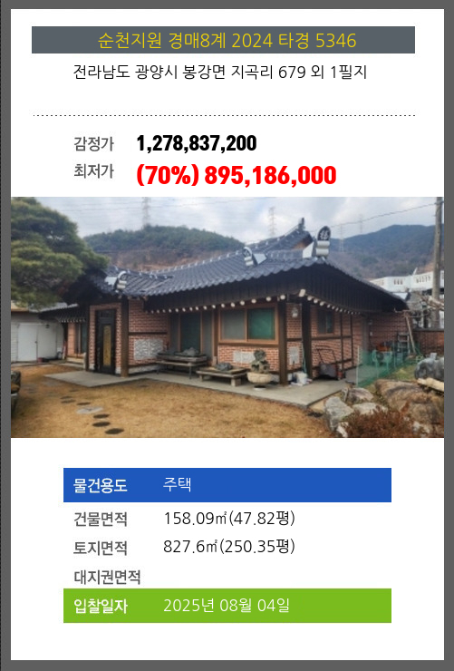 사건번호 2024 타경 5346 본건은 전라남도 광양시 봉강면 지곡리 679 외 1필지소재하는 주택경매 물건의 포스팅입니다. 건물면적 [ 158.09㎡ (47.82평) ]토지면적 [ 827.6㎡ (250.35평) ] 시세를