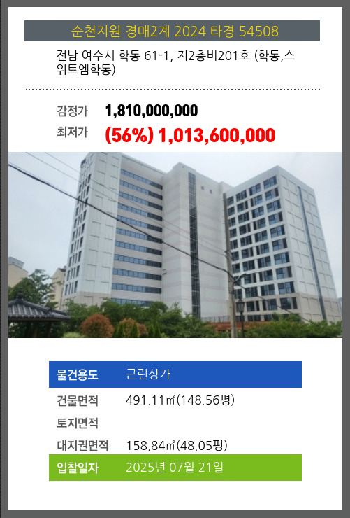 사건번호 2024 타경 54508 본건은 전남 여수시 학동 61-1, 지2층비201호 (학동,스위트엠학동)소재하는 근린상가경매 물건의 포스팅입니다. 건물면적 [ 491.11㎡ (148.56평) ]대지권 [ 158.84㎡ (48.05평) ] 시세를 반영한