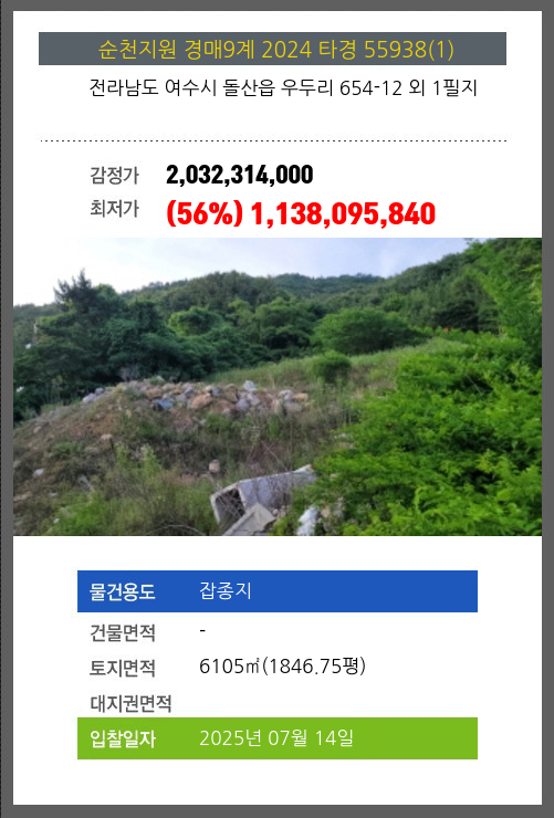 사건번호 2024 타경 55938(1) 본건은 전라남도 여수시 돌산읍 우두리 654-12 외 1필지소재하는 잡종지경매 물건의 포스팅입니다. 토지면적 [ 6105㎡ (1846.75평) ] 시세를 반영한 감정가 2,032,314,000에서2회 유찰되어