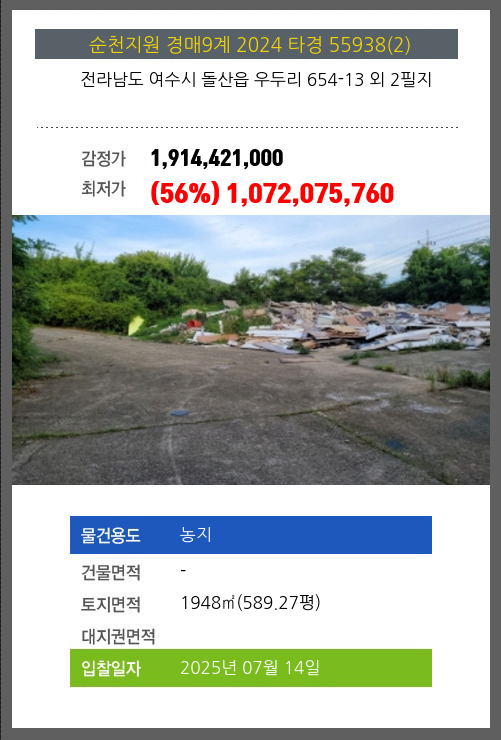 사건번호 2024 타경 55938(2) 본건은 전라남도 여수시 돌산읍 우두리 654-13 외 2필지소재하는 농지경매 물건의 포스팅입니다. 토지면적 [ 1948㎡ (589.27평) ] 시세를 반영한 감정가 1,914,421,000에서2회 유찰되어