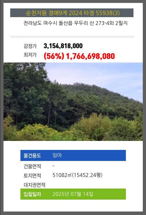 사건번호 2024 타경 55938(3) 본건은 전라남도 여수시 돌산읍 우두리 산 273-4외 2필지소재하는 임야경매 물건의 포스팅입니다. 토지면적 [ 51082㎡ (15452.24평) ] 시세를 반영한 감정가 3,154,818,000에서2회 유찰되어