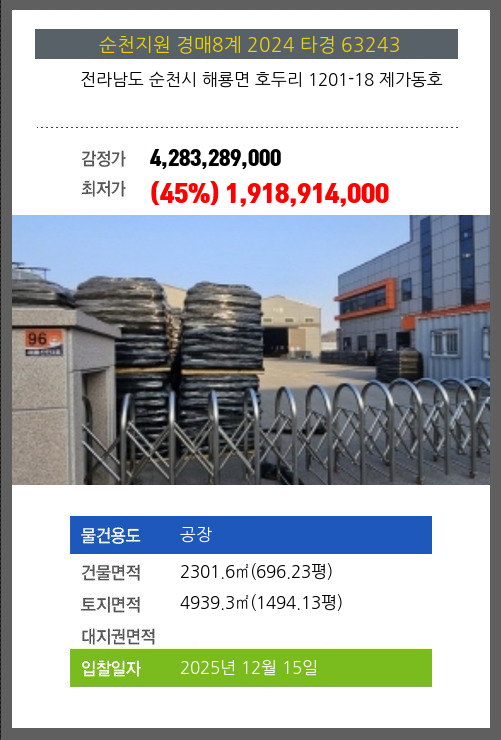 사건번호 2024 타경 63243 본건은 전라남도 순천시 해룡면 호두리 1201-18 제가동호소재하는 공장경매 물건의 포스팅입니다. 건물면적 [ 2301.6㎡ (696.23평) ]토지면적 [ 4939.3㎡ (1494.13평) ] 시세를 반영한