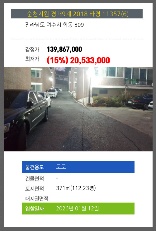 사건번호 2018 타경 11357(6) 본건은 전라남도 여수시 학동 309소재하는 도로경매 물건의 포스팅입니다. 토지면적 [ 371㎡ (112.23평) ] 시세를 반영한 감정가 139,867,000에서4회 유찰되어 감정가 대비 15%최저가