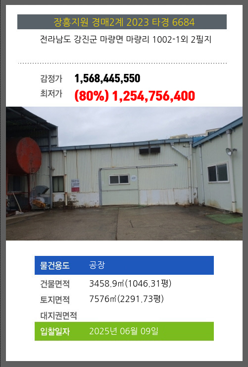 사건번호 2023 타경 6684 본건은 전라남도 강진군 마량면 마량리 1002-1외 2필지소재하는 공장경매 물건의 포스팅입니다. 건물면적 [ 3458.9㎡ (1046.31평) ]토지면적 [ 7576㎡ (2291.73평) ] 시세를 반영한