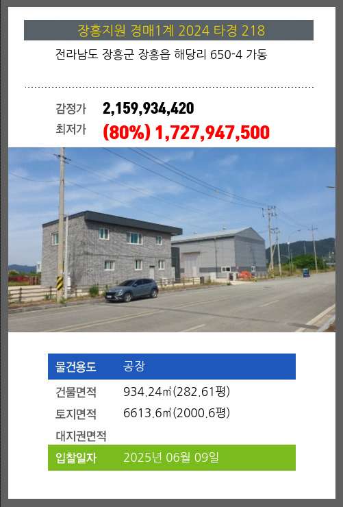 사건번호 2024 타경 218 본건은 전라남도 장흥군 장흥읍 해당리 650-4 가동소재하는 공장경매 물건의 포스팅입니다. 건물면적 [ 934.24㎡ (282.61평) ]토지면적 [ 6613.6㎡ (2000.6평) ] 시세를 반영한