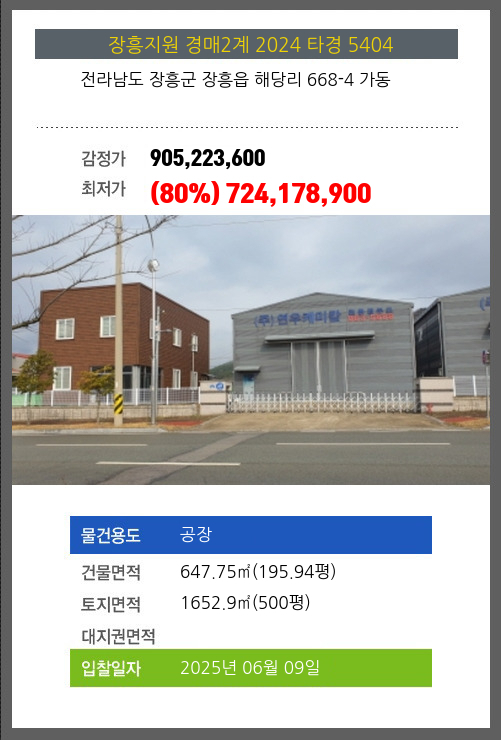 사건번호 2024 타경 5404 본건은 전라남도 장흥군 장흥읍 해당리 668-4 가동소재하는 공장경매 물건의 포스팅입니다. 건물면적 [ 647.75㎡ (195.94평) ]토지면적 [ 1652.9㎡ (500평) ] 시세를 반영한