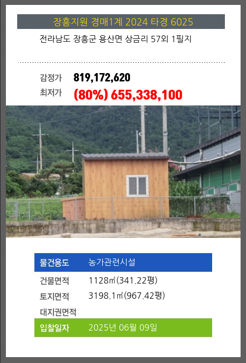 사건번호 2024 타경 6025 본건은 전라남도 장흥군 용산면 상금리 57외 1필지소재하는 농가관련시설경매 물건의 포스팅입니다. 건물면적 [ 1128㎡ (341.22평) ]토지면적 [ 3198.1㎡ (967.42평) ] 시세를 반영한
