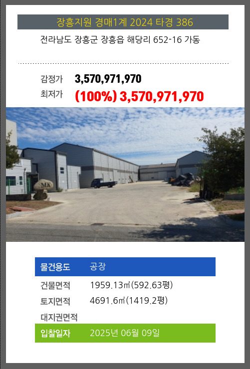 사건번호 2024 타경 386 본건은 전라남도 장흥군 장흥읍 해당리 652-16 가동소재하는 공장경매 물건의 포스팅입니다. 건물면적 [ 1959.13㎡ (592.63평) ]토지면적 [ 4691.6㎡ (1419.2평) ] 시세를 반영한