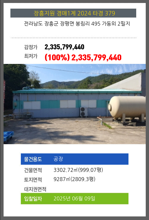 사건번호 2024 타경 379 본건은 전라남도 장흥군 장평면 봉림리 495 가동외 2필지소재하는 공장경매 물건의 포스팅입니다. 건물면적 [ 3302.72㎡ (999.07평) ]토지면적 [ 9287㎡ (2809.3평) ] 시세를