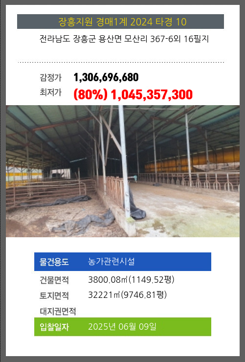사건번호 2024 타경 10 본건은 전라남도 장흥군 용산면 모산리 367-6외 16필지소재하는 농가관련시설경매 물건의 포스팅입니다. 건물면적 [ 3800.08㎡ (1149.52평) ]토지면적 [ 32221㎡ (9746.81평) ] 시세를 반영한