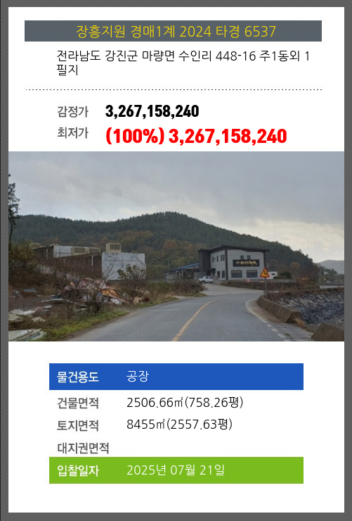 사건번호 2024 타경 6537 본건은 전라남도 강진군 마량면 수인리 448-16 주1동외 1필지소재하는 공장경매 물건의 포스팅입니다. 건물면적 [ 2506.66㎡ (758.26평) ]토지면적 [ 8455㎡ (2557.63평) ] 시세를