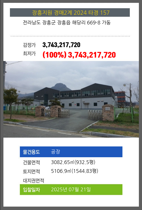 사건번호 2024 타경 157 본건은 전라남도 장흥군 장흥읍 해당리 669-8 가동소재하는 공장경매 물건의 포스팅입니다. 건물면적 [ 3082.65㎡ (932.5평) ]토지면적 [ 5106.9㎡ (1544.83평) ] 시세를 반영한