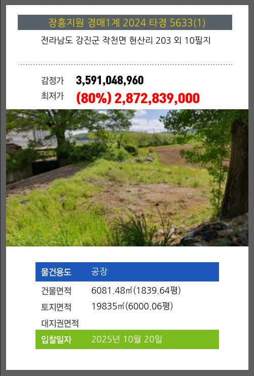 사건번호 2024 타경 5633(1) 본건은 전라남도 강진군 작천면 현산리 203 외 10필지소재하는 공장경매 물건의 포스팅입니다. 건물면적 [ 6081.48㎡ (1839.64평) ]토지면적 [ 19835㎡ (6000.06평) ] 시세를