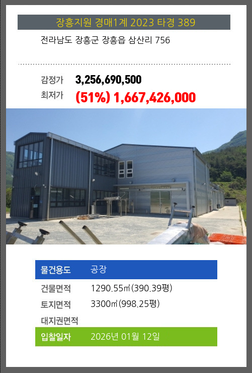 사건번호 2023 타경 389 본건은 전라남도 장흥군 장흥읍 삼산리 756소재하는 공장경매 물건의 포스팅입니다. 건물면적 [ 1290.55㎡ (390.39평) ]토지면적 [ 3300㎡ (998.25평) ] 시세를 반영한 감정가