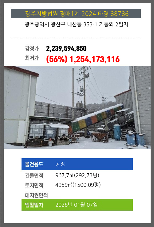 사건번호 2024 타경 88786 본건은 광주광역시 광산구 내산동 353-1 가동외 2필지소재하는 공장경매 물건의 포스팅입니다. 건물면적 [ 967.7㎡ (292.73평) ]토지면적 [ 4959㎡ (1500.09평) ] 시세를 반영한