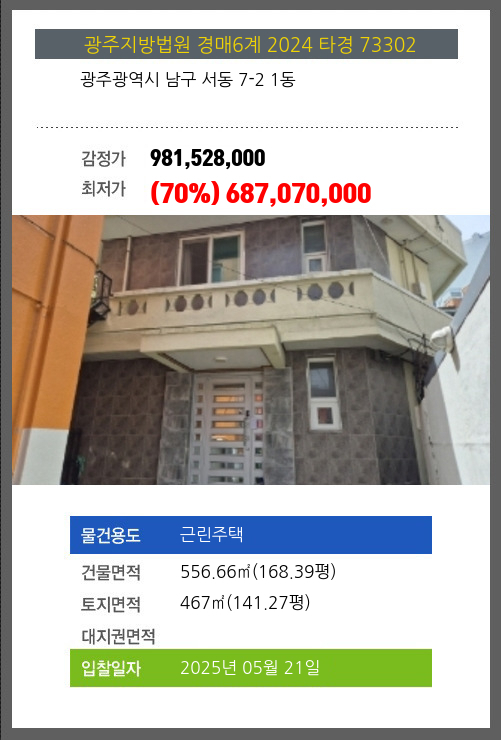 사건번호 2024 타경 73302 본건은 광주광역시 남구 서동 7-2 1동소재하는 근린주택경매 물건의 포스팅입니다. 건물면적 [ 556.66㎡ (168.39평) ]토지면적 [ 467㎡ (141.27평) ] 시세를 반영한 감정가