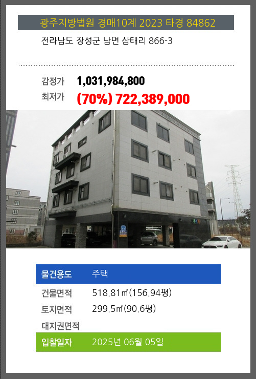 사건번호 2023 타경 84862 본건은 전라남도 장성군 남면 삼태리 866-3소재하는 주택경매 물건의 포스팅입니다. 건물면적 [ 518.81㎡ (156.94평) ]토지면적 [ 299.5㎡ (90.6평) ] 시세를 반영한 감정가
