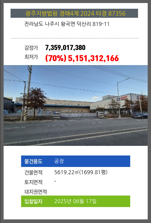 사건번호 2024 타경 87356 본건은 전라남도 나주시 왕곡면 덕산리 819-11소재하는 공장경매 물건의 포스팅입니다. 건물면적 [ 5619.22㎡ (1699.81평) ] 시세를 반영한 감정가 7,359,017,380에서1회 유찰되어 감정가 대비