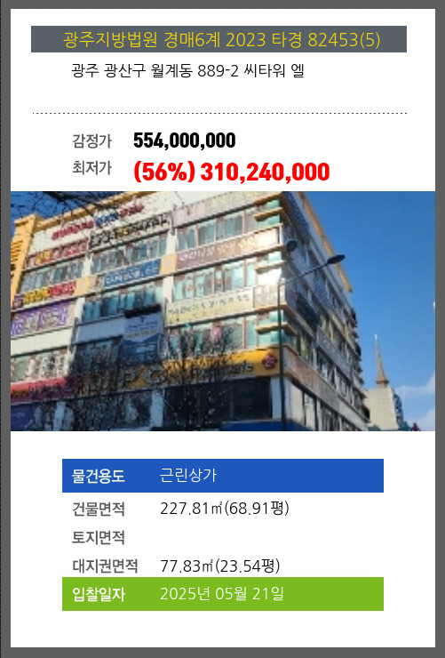 사건번호 2023 타경 82453(4) 본건은 광주 광산구 월계동 889-2 씨타워 엘소재하는 근린상가경매 물건의 포스팅입니다. 건물면적 [ 246.99㎡ (74.71평) ]대지권 [ 84.39㎡ (25.53평) ] 시세를 반영한