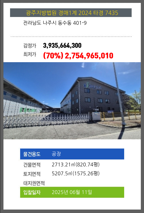 사건번호 2024 타경 7435 본건은 전라남도 나주시 동수동 401-9소재하는 공장경매 물건의 포스팅입니다. 건물면적 [ 2713.21㎡ (820.74평) ]토지면적 [ 5207.5㎡ (1575.26평) ] 시세를 반영한 감정가 3,935,664,300에서1회