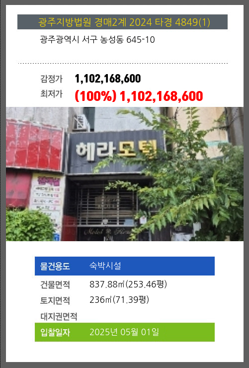 사건번호 2024 타경 4849(1) 본건은 광주광역시 서구 농성동 645-10소재하는 숙박시설경매 물건의 포스팅입니다. 건물면적 [ 837.88㎡ (253.46평) ]토지면적 [ 236㎡ (71.39평) ] 시세를 반영한 감정가 1,102,168,600에서신건으로
