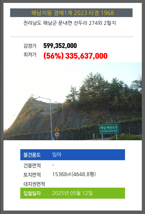 사건번호 2023 타경 1968 본건은 전라남도 해남군 문내면 선두리 274외 2필지소재하는 임야경매 물건의 포스팅입니다. 토지면적 [ 15368㎡ (4648.8평) ] 시세를 반영한 감정가 599,352,000에서2회 유찰되어 감정가