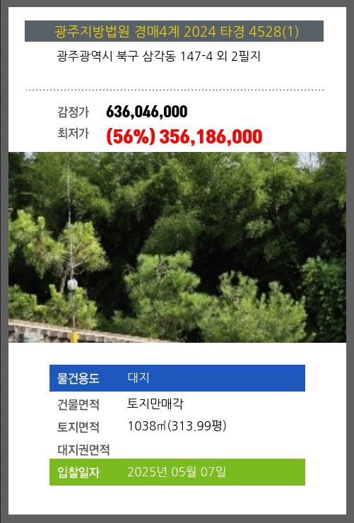 사건번호 2024 타경 4528(1) 본건은 광주광역시 북구 삼각동 147-4 외 2필지소재하는 대지경매 물건의 포스팅입니다. 건물면적 [ 토지만매각 ]토지면적 [ 1038㎡ (313.99평) ] 시세를 반영한 감정가