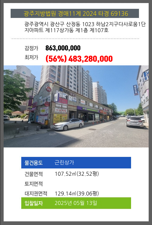 사건번호 2024 타경 69136 본건은 광주광역시 광산구 산정동 1023 하남2지구다사로움1단지아파트 제117상가동 제1층 제107호소재하는 근린상가경매 물건의 포스팅입니다. 건물면적 [ 107.52㎡ (32.52평) ]대지권 [ 129.14㎡ (39.06평) ]