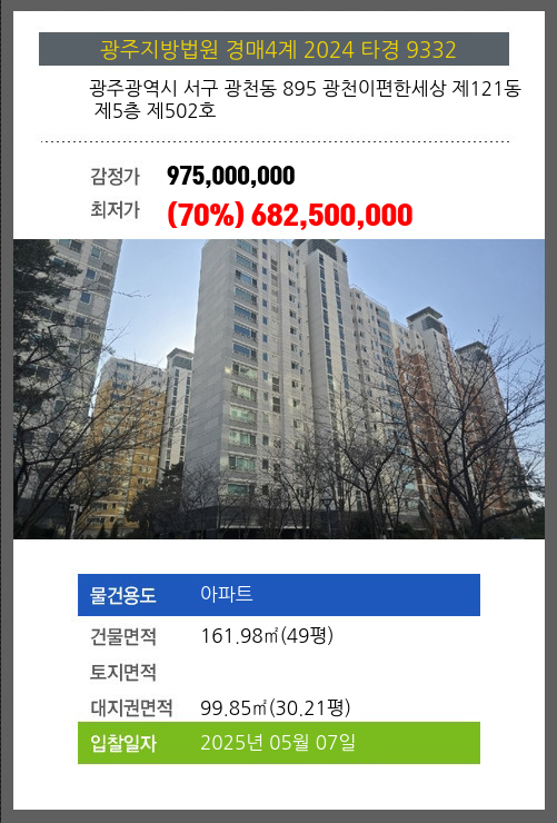 사건번호 2024 타경 9332 본건은 광주광역시 서구 광천동 895 광천이편한세상 제121동 제5층 제502호소재하는 아파트경매 물건의 포스팅입니다. 건물면적 [ 161.98㎡ (49평) ]대지권 [ 99.85㎡ (30.21평) ]
