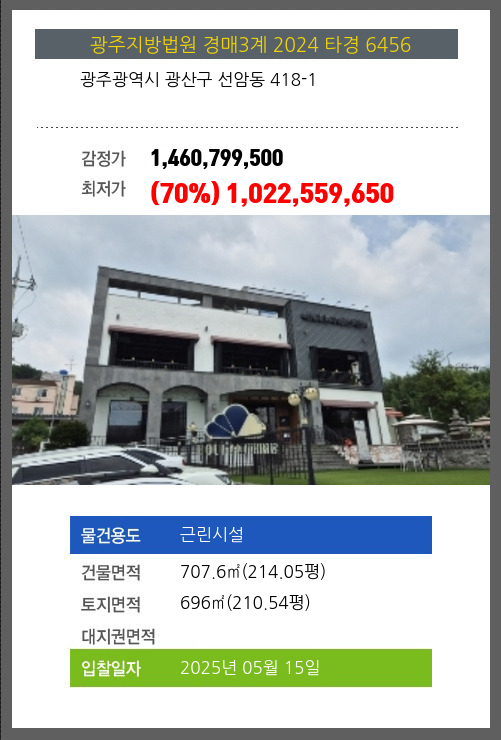 사건번호 2024 타경 6456 본건은 광주광역시 광산구 선암동 418-1소재하는 근린시설경매 물건의 포스팅입니다. 건물면적 [ 707.6㎡ (214.05평) ]토지면적 [ 696㎡ (210.54평) ] 시세를 반영한 감정가 1,460,799,500에서1회