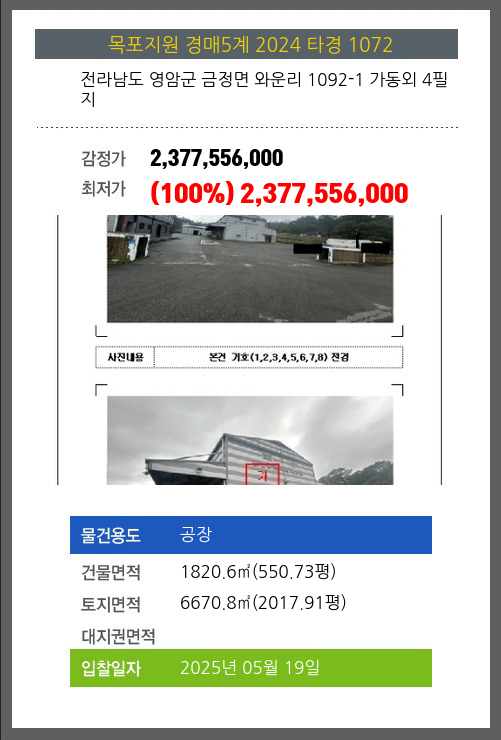 사건번호 2024 타경 1072 본건은 전라남도 영암군 금정면 와운리 1092-1 가동외 4필지소재하는 공장경매 물건의 포스팅입니다. 건물면적 [ 1820.6㎡ (550.73평) ]토지면적 [ 6670.8㎡ (2017.91평) ] 시세를