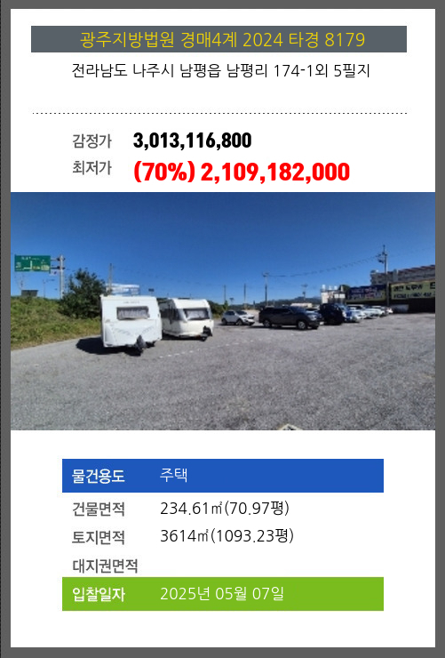 사건번호 2024 타경 8179 본건은 전라남도 나주시 남평읍 남평리 174-1외 5필지소재하는 주택경매 물건의 포스팅입니다. 건물면적 [ 234.61㎡ (70.97평) ]토지면적 [ 3614㎡ (1093.23평) ] 시세를 반영한