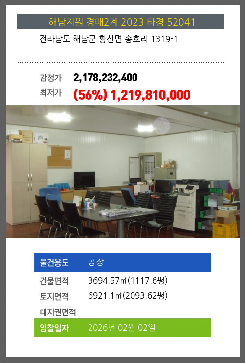 사건번호 2023 타경 52041 본건은 전라남도 해남군 황산면 송호리 1319-1소재하는 공장경매 물건의 포스팅입니다. 건물면적 [ 3694.57㎡ (1117.6평) ]토지면적 [ 6921.1㎡ (2093.62평) ] 시세를 반영한 감정가