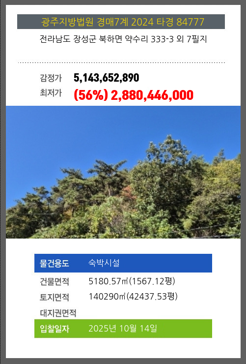 사건번호 2024 타경 84777 본건은 전라남도 장성군 북하면 약수리 333-3 외 7필지소재하는 숙박시설경매 물건의 포스팅입니다. 건물면적 [ 5180.57㎡ (1567.12평) ]토지면적 [ 140290㎡ (42437.53평) ] 시세를
