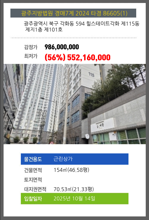 사건번호 2024 타경 86605(1) 본건은 광주광역시 북구 각화동 594 힐스테이트각화 제115동 제지1층 제101호소재하는 근린상가경매 물건의 포스팅입니다. 건물면적 [ 154㎡ (46.58평) ]대지권 [ 70.53㎡ (21.33평) ]