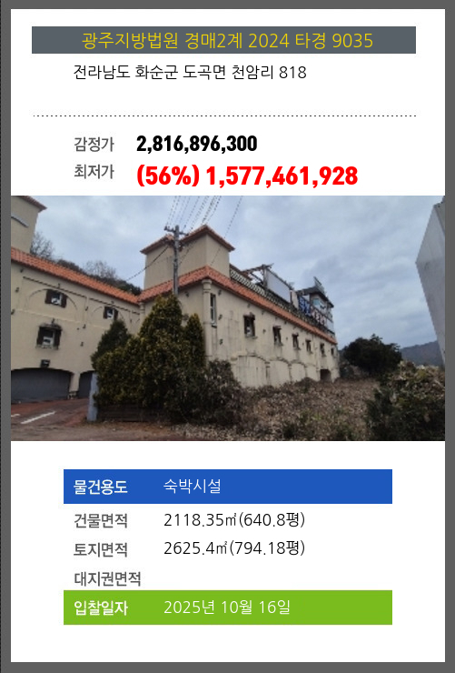 사건번호 2024 타경 9035 본건은 전라남도 화순군 도곡면 천암리 818소재하는 숙박시설경매 물건의 포스팅입니다. 건물면적 [ 2118.35㎡ (640.8평) ]토지면적 [ 2625.4㎡ (794.18평) ] 시세를 반영한 감정가