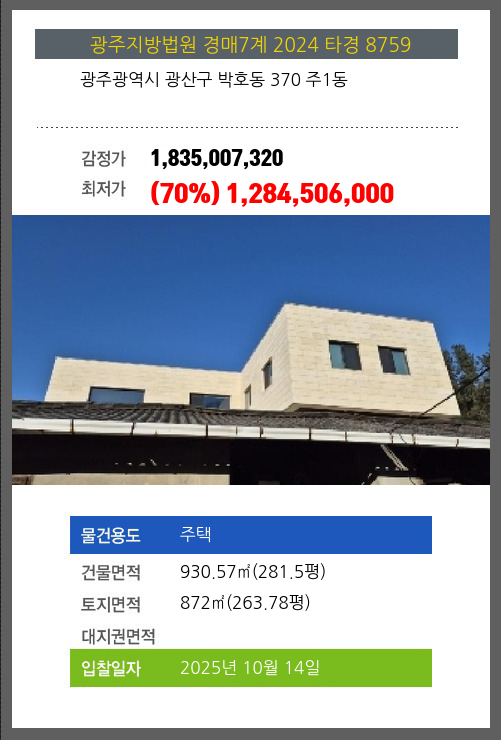 사건번호 2024 타경 8759 본건은 광주광역시 광산구 박호동 370 주1동소재하는 주택경매 물건의 포스팅입니다. 건물면적 [ 930.57㎡ (281.5평) ]토지면적 [ 872㎡ (263.78평) ] 시세를 반영한 감정가