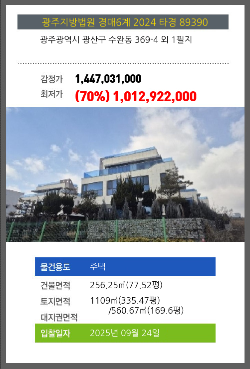 사건번호 2024 타경 89390 본건은 광주광역시 광산구 수완동 369-4 외 1필지소재하는 주택경매 물건의 포스팅입니다. 건물면적 [ 256.25㎡ (77.52평) ]토지면적 [ 전체:1109㎡ (335.47평) 매각지분:560.67㎡ (169.6평) ]