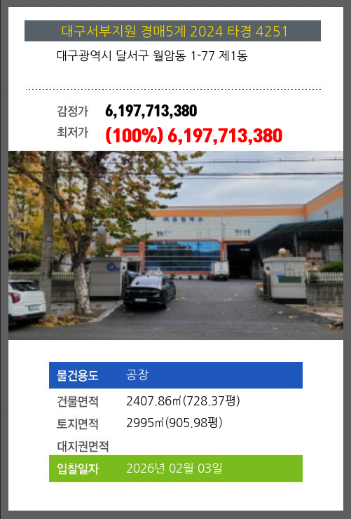 사건번호 2024 타경 4251 본건은 대구광역시 달서구 월암동 1-77 제1동소재하는 공장경매 물건의 포스팅입니다. 건물면적 [ 2407.86㎡ (728.37평) ]토지면적 [ 2995㎡ (905.98평) ] 시세를 반영한 감정가
