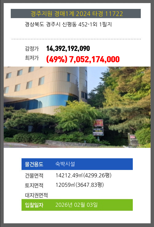 사건번호 2024 타경 11722 본건은 경상북도 경주시 신평동 452-1외 1필지소재하는 숙박시설경매 물건의 포스팅입니다. 건물면적 [ 14212.49㎡ (4299.26평) ]토지면적 [ 12059㎡ (3647.83평) ] 시세를 반영한 감정가