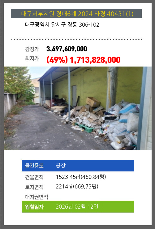 사건번호 2024 타경 40431(1) 본건은 대구광역시 달서구 장동 306-102소재하는 공장경매 물건의 포스팅입니다. 건물면적 [ 1523.45㎡ (460.84평) ]토지면적 [ 2214㎡ (669.73평) ] 시세를 반영한 감정가 3,497,609,000에서2회