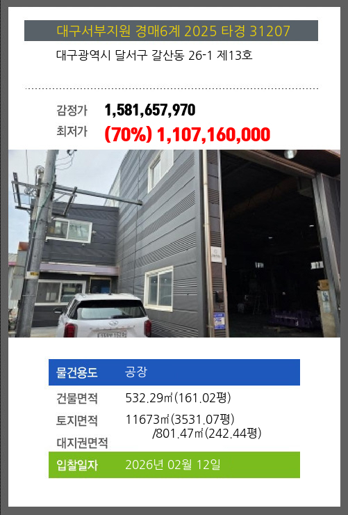 사건번호 2025 타경 31207 본건은 대구광역시 달서구 갈산동 26-1 제13호소재하는 공장경매 물건의 포스팅입니다. 건물면적 [ 532.29㎡ (161.02평) ]토지면적 [ 전체:11673㎡ (3531.07평) 매각지분:801.47㎡ (242.44평) ] 시세를