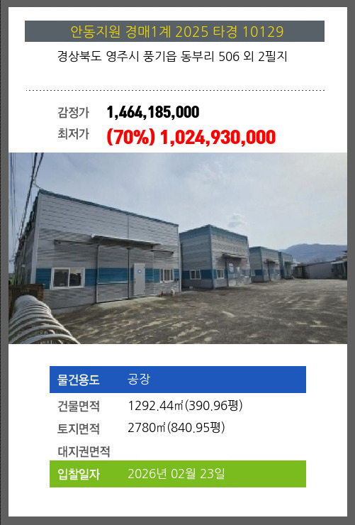 사건번호 2025 타경 10129 본건은 경상북도 영주시 풍기읍 동부리 506 외 2필지소재하는 공장경매 물건의 포스팅입니다. 건물면적 [ 1292.44㎡ (390.96평) ]토지면적 [ 2780㎡ (840.95평) ] 시세를