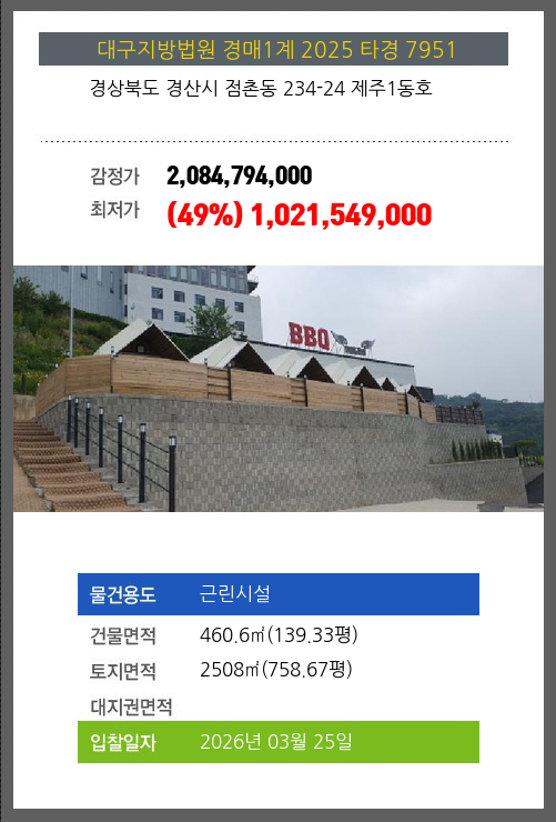 사건번호 2025 타경 7951 본건은 경상북도 경산시 점촌동 234-24 제주1동호소재하는 근린시설경매 물건의 포스팅입니다. 건물면적 [ 460.6㎡ (139.33평) ]토지면적 [ 2508㎡ (758.67평) ] 시세를 반영한 감정가