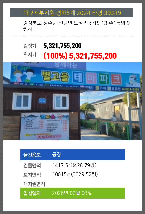 사건번호 2025 타경 31859 본건은 경상북도 고령군 다산면 송곡리 1441-1소재하는 공장경매 물건의 포스팅입니다. 건물면적 [ 5654.91㎡ (1710.6평) ]토지면적 [ 6749.3㎡ (2041.65평) ] 시세를 반영한 감정가